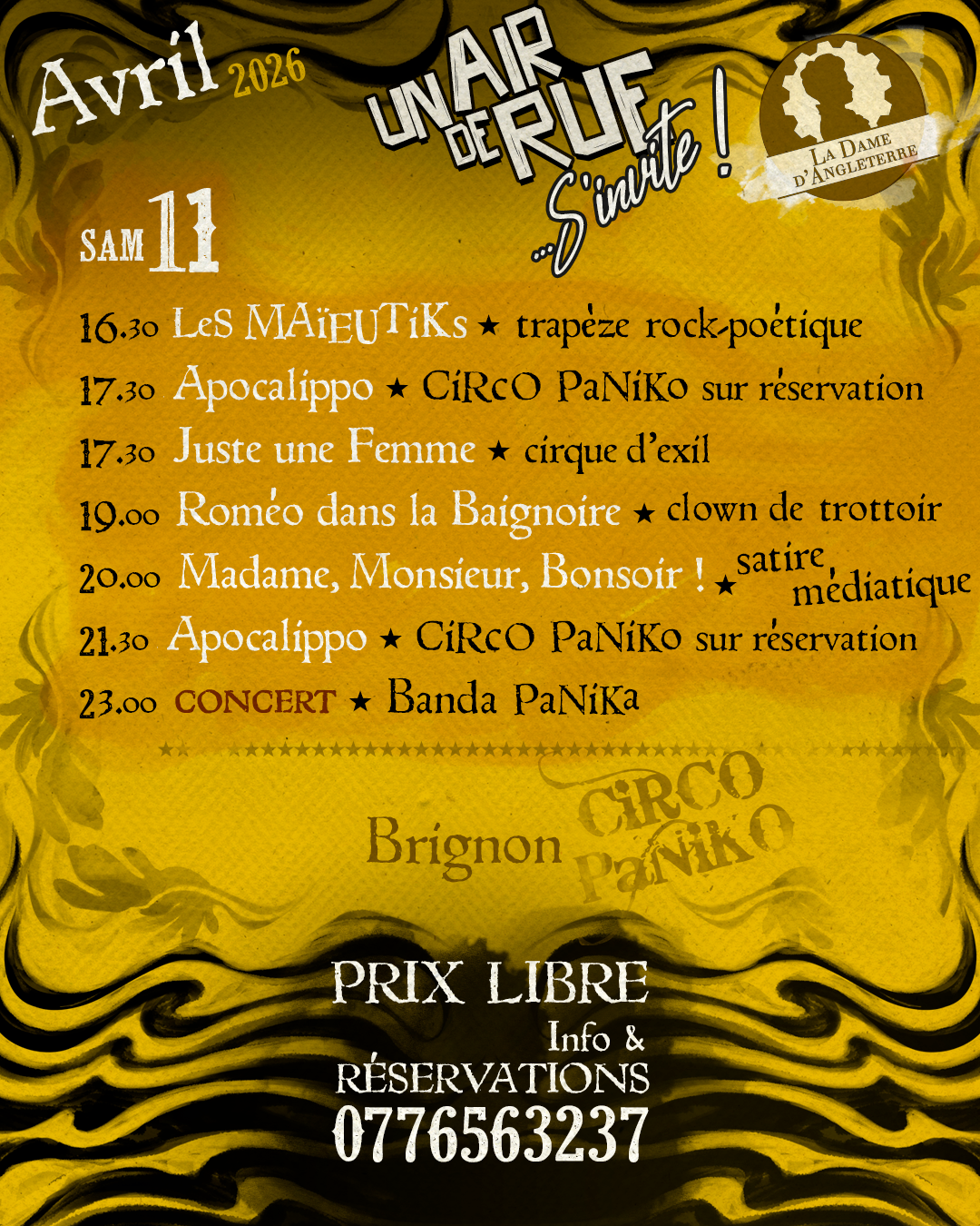 A l’occasion de l’accueil du splendide cirque franco italien, Circo Paniko, du 03 au 12 avril, la Dame d’Angleterre s’invite au cirque et vous propose une troisième édition du festival.